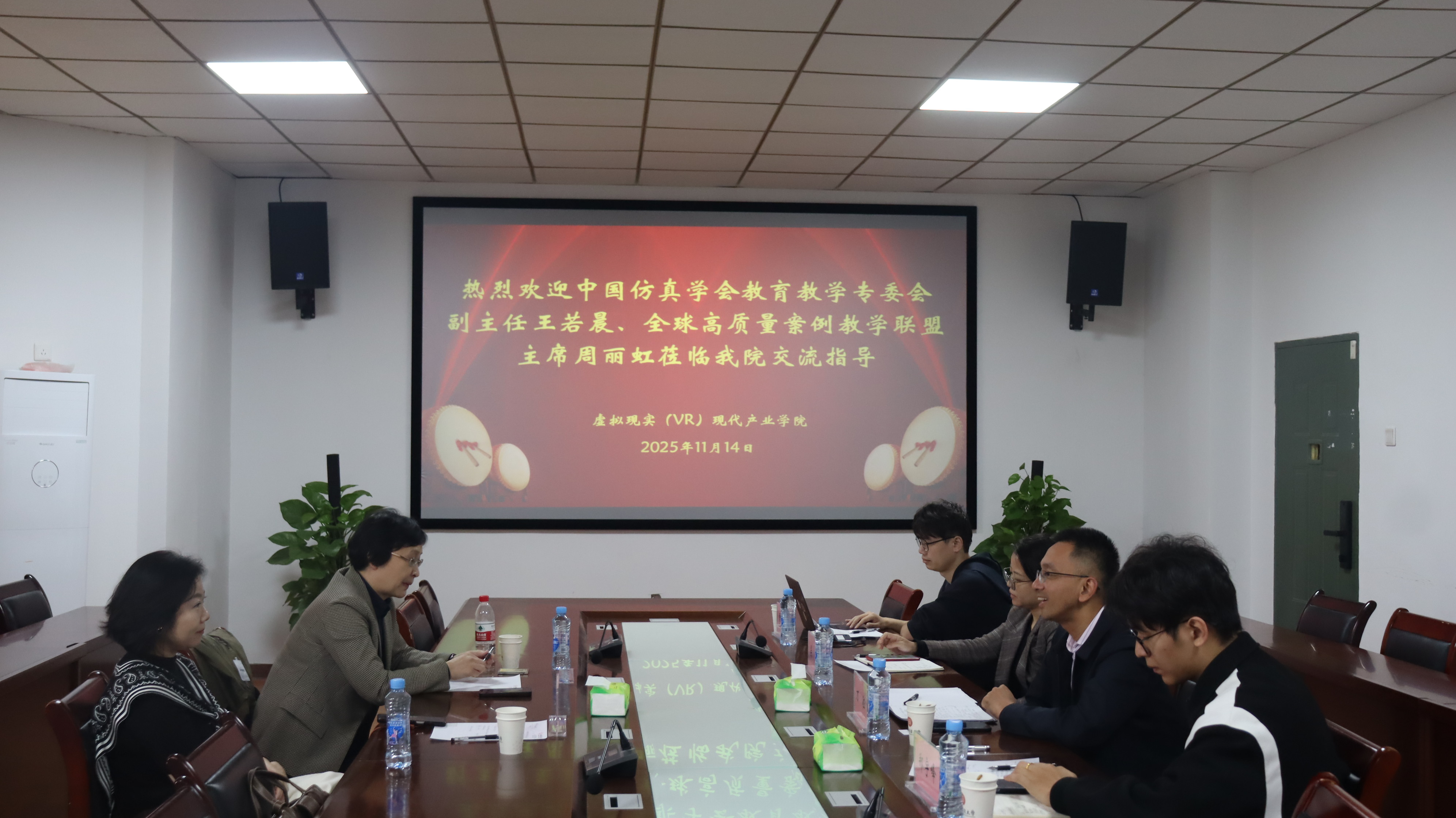 交流中,王若晨副主任详解中国仿真学会教育教学专委会的研究领域,聚焦仿真技术在教育教学中的应用推广、学科建设指导等工作,以及与高校、企业的合作模式与成果。周丽虹主席介绍了全球高质量案例教学联盟的发展概况,重点阐述案例教学资源整合、国际化教学合作等核心业务。两位专家均明确表达了与学院的合作意向,初步规划在VR领域案例开发、教学模式创新、学术交流等方面开展深度合作。