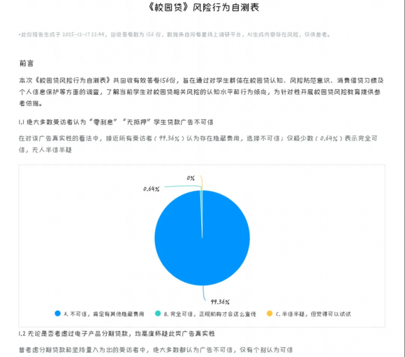 本次一共收集有效答卷156份,数据显示,我院学生对于假贷款广告保持高度警惕,普遍具备详细的消费与还款计划。但同时,同学们对于“培训贷”等新型骗局仍存在极小比例的认知盲区,对隐蔽性更强的金融陷阱普及仍需加强。