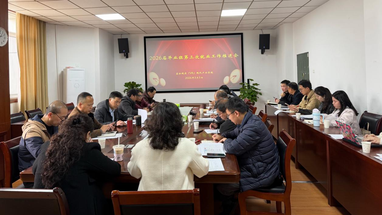 虚拟现实(VR)现代产业学院为扎实推进毕业生就业工作,细化落实本学期就业重点任务,3月5日,我院在青云楼召开2026届毕业生第三次就业工作推进会。学院党委书记彭敏、副书记刘前、党委委员兼教务办主任吴洁、毕业班班主任、年级辅导员及相关老师参加会议,会议由学院就业专员郑静主持。