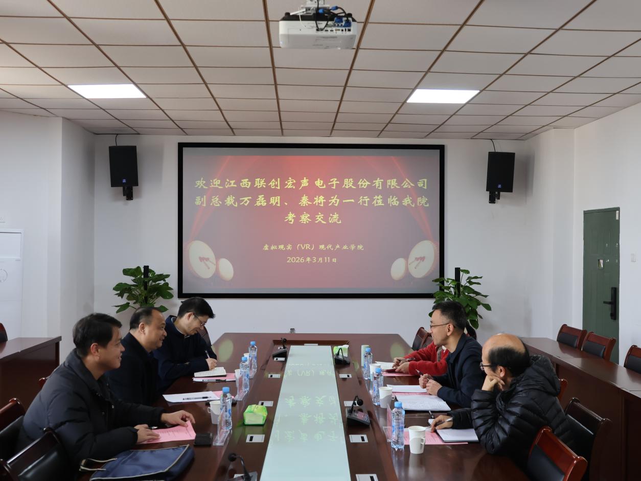 虚拟现实(VR)现代产业学院2026年3月11日上午,江西联创宏声电子股份有限公司副总裁万磊明、秦将为,人事经理张攀一行莅临我院考察交流。学院院长万征,副院长李华旸、吴洁参与接待并座谈。